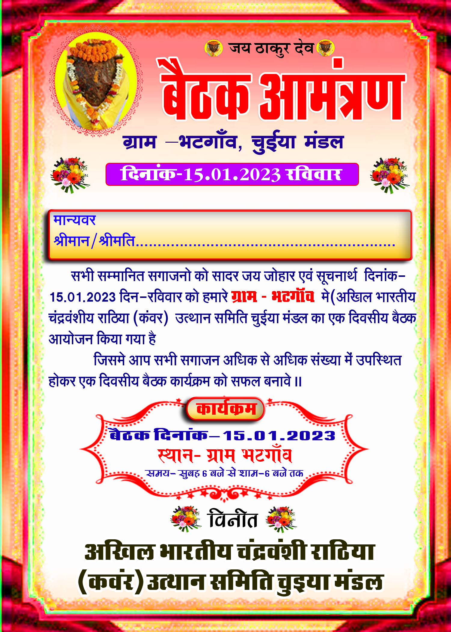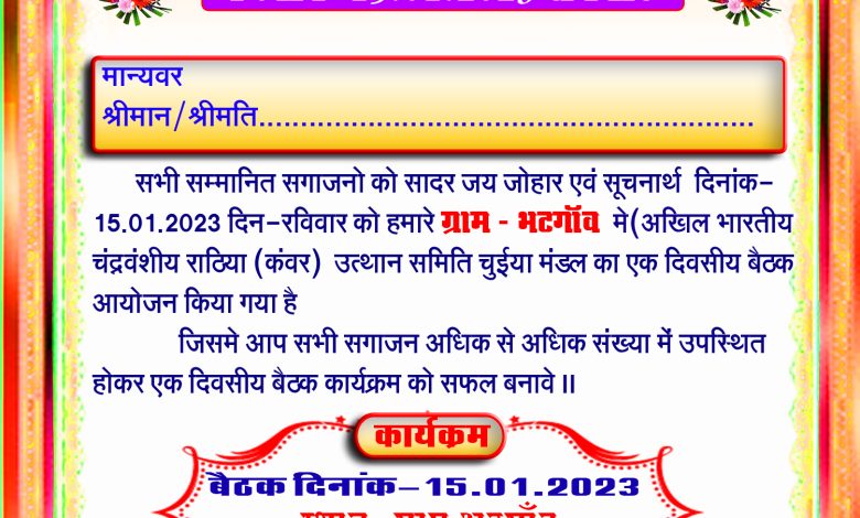 कोरबा 14जनवरी कोरबा जिले के ग्राम पंचायत चुइया के ग्राम भटगांव में कल रविवार दिनांक 14जनवरी को अखिल भारतीय चंद्र वंशी राठिया कंवर उत्थान समिति चुइया मंडल का एक दिवसीय बैठक कल सुबह 6 बजे से शाम 6बजे तक आयोजन किया जाएगा,जिसमे राठिया कंवर समाज के लोगों को अधिक से अधिक संख्या में शामिल होने के लिए सादर आमंत्रित किया गया है इस कार्यक्रम में अपने समाज के अंतर्गत विभिन्न समस्याओ का समाधान एवम आगामी योजना का प्रचार प्रसार कर समाज को सशक्त बनाया जायेगा।इस कार्यक्रम में अखिल भारतीय स्तर के पदाधिकारी शामिल होकर समाज को गति प्रदान करेंगें।