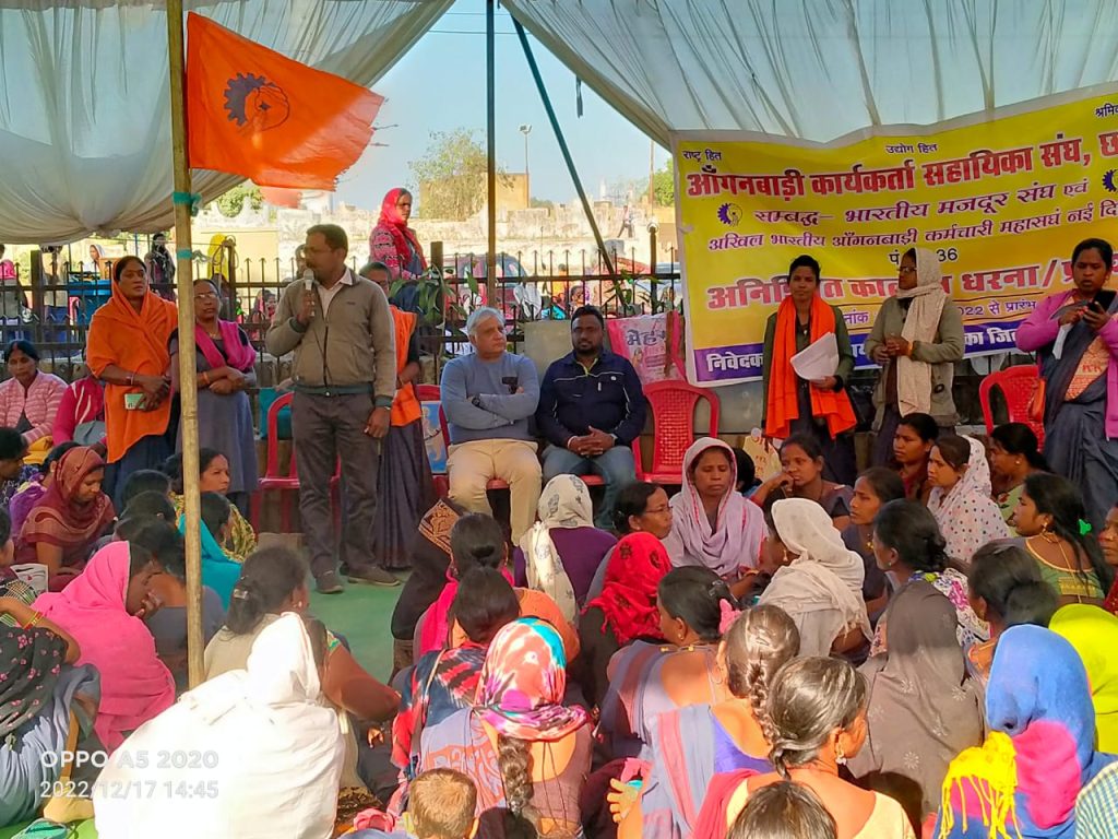 Korbavani.com- कोरबा जिले में आंगनबाड़ी कार्यकर्ता सहायिका संघ के आंदोलन को भारतीय मजदूर संघ से संबंद्ध विभिन्न अनुषांगिक सघो/उद्योगों के द्वारा बारी-बारी से धरना स्थल पहुंचकर समर्थन दिया जा रहा है। आज चौथे दिन धरना स्थल पर छत्तीसगढ़ बिजली उत्पादन कर्मचारी संघ के प्रांतीय संयुक्त महामंत्री शब्बीर मेमन, भारतीय मजदूर संघ के जिलाध्यक्ष शरद शरद नायर, कार्यकारी अध्यक्ष संजीव शरद शर्मा एवं जिला मंत्री नवरतन बरेठ ने धरना स्थल पहुंचकर आंदोलन में शामिल हुए एवं समर्थन दिया। तथा आंदोलनरत आंगनबाड़ी कार्यकर्ता सहायिका के बहनों को आश्वस्त किया कि उनकी मांग जायज है, 8 मांगों में ऐसा कोई भी मांग नहीं है जिसको पूरा नहीं किया जा सकता। जब तक उनकी मांगे पूरी नहीं होती है तब तक भारतीय मजदूर संघ के प्रत्येक संगठन उनके साथ खड़ी है निश्चित रूप से सफलता मिलेगी। आंगनबाड़ी कार्यकर्ता सहायिका संघ के आंदोलन में बैठे कार्यकर्ता बहनों को संबोधित करते हुए शब्बीर मेमन ने कहा कि हमारी आंगनबाड़ी की बहने कोरोना जैसे गंभीर महामारी के समय भी अपनी जान जोखिम में डालकर दिन-रात सेवा की है हम सब ने देखा है केंद्र सरकार हो चाहे राज्य सरकार हो उनकी विभिन्न सरकारी योजनाओं को धरातल पर फलीभूत करने के लिए सरकारी आंगनबाड़ी कार्यकर्ताओ एवं सहायिकाओं से ही उपयोग करती है यदि यह बहने कार्य नहीं करती तो सरकार की कोई भी योजना धरातल पर लागू नहीं हो सकता है। निश्चित रूप से सरकार को चाहिए कि इन्हें शासकीय कर्मचारी घोषित किए करें और जब तक नहीं करती है तब तक कलेक्टर दर पर भुगतान करें।