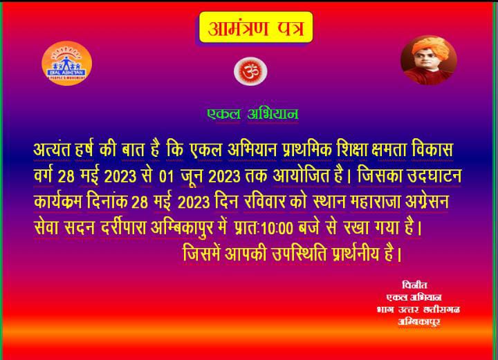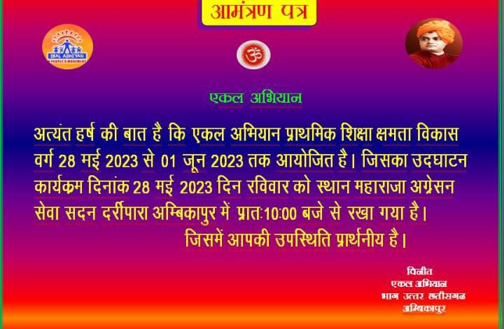 अंबिकापुर 27मई,वन बंधु परिषद एवम एकल ग्राम संगठन द्वारा संचालित एकल अभियान भाग अंबिकापुर का प्राथमिक शिक्षा क्षमता विकास वर्ग कल 28मई 2023 सुबह 10बजे से उद्घाटन होकर 1जून 2023 तक स्थान महाराजा अग्रसेन सेवा सदन दर्री पारा अंबिकापुर में संपन्न होगा। इस पांच दिवसीय वर्ग में भाग अंबिकापुर के 6अंचल से सभी अंचल प्राथमिक शिक्षा,अंचल ग्राम स्वराज प्रमुख एवम सभी संच प्रमुख शामिल होकर अपना क्षमता का विकास कर अपने अपने कार्य क्षेत्र में परिणाम लायेंगें।इस उद्देश्य से प्रत्येक वर्ष में एक बार इस वर्ग को आयोजित किया जाता है।इस वर्ग में प्रातः 4बजे से लेकर रात्रि 10बजे तक निश्चित समय सारणी के हिसाब से संचालन किया जायेगा।