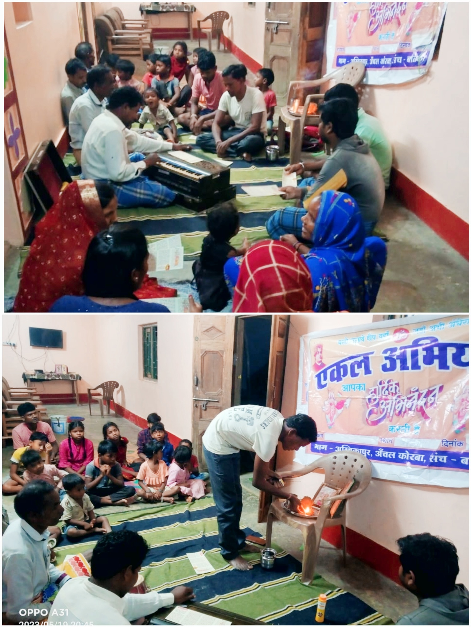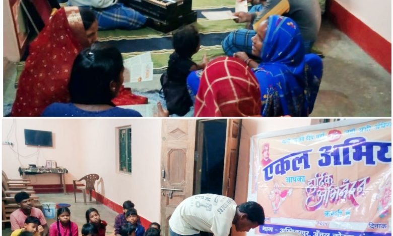 सतरेंगा 20मई,अजगर बहार तहसील के अंतर्गत सुदूर वनांचल क्षेत्र में एकल अभियान संच केंद्र बालको के बैनर तले कई ग्रामों में सामूहिक हनुमान चालीसा पाठ का आध्यात्मिक कार्यक्रम आयोजित किया जा रहा है इसी कड़ी में कल रात्रि विद्यालय ग्राम सतरेंगा में ग्राम प्रमुख एवम सरपंच धनसिंह कंवर एवम सत्संग प्रमुख शिवरतन कंवर के गरिमामय उपस्थिति में वादन के साथ ओंकार मंत्र गायत्री मंत्र विजया महा मंत्र एवम श्री हनुमान चालीसा पाठ किया गया,एकल अभियान संच केंद्र बालको के संच प्रमुख सत्यनारायण कंवर के नेतृत्व में कई विद्यालय ग्रामों में सामूहिक हनुमान चालीसा पाठ संपन्न किया जा चुका है,इस अवसर पर समाज सेवक एवम वरिष्ठ कार्यकर्ता धन सिंह कंवर सरपंच,संच प्रमुख सत्यनारायण कंवर आचार्य लक्ष्मी कंवर,ममता कंवर,रामेश्वर सिंह कंवर,कुमार सिंह कंवर,श्री शिवतन सिंह कंवर ,गुलाब दास महंत,