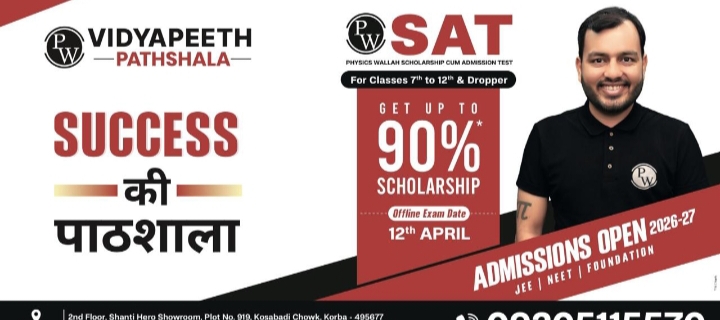 Korbavani.com। शहर के विद्यार्थियों के लिए एक बड़ा शैक्षणिक अवसर सामने आया है। Physics Wallah Vidyapeeth Pathshala, Korba द्वारा 12 अप्रैल को मेगा ऑफलाइन स्कॉलरशिप टेस्ट (SAT) आयोजित किया जा रहा है। इस परीक्षा के माध्यम से कक्षा 8वीं से 12वीं तक के छात्र और JEE/NEET की तैयारी कर रहे अभ्यर्थी 90 प्रतिशत तक स्कॉलरशिप प्राप्त कर सकते हैं।संस्थान प्रबंधन के अनुसार, इस पहल का उद्देश्य छात्रों को कम शुल्क में उच्च गुणवत्ता वाली ऑफलाइन कोचिंग उपलब्ध कराना है। चयनित विद्यार्थियों को 2-टीचर लर्निंग मॉडल, अनुभवी शिक्षकों द्वारा कॉन्सेप्ट आधारित पढ़ाई, नियमित टेस्ट, परफॉर्मेंस ट्रैकिंग और दैनिक डाउट सपोर्ट जैसी सुविधाएं दी जाएंगी। साथ ही, बेहतर व्यक्तिगत ध्यान सुनिश्चित करने के लिए बैचों में सीमित सीटें रखी गई हैं।इस स्कॉलरशिप टेस्ट को आकर्षक बनाने के लिए विशेष प्रोत्साहन भी घोषित किए गए हैं। परीक्षा में बेहतर प्रदर्शन करने वाले टॉप 100 छात्रों को गिफ्ट हैम्पर दिए जाएंगे, जबकि टॉप 11 छात्रों को पूरी तरह फ्री सीट पर पढ़ने का अवसर मिलेगा। कोरबा के विद्यार्थियों के लिए कुल 50 लाख रुपये तक की स्कॉलरशिप निर्धारित की गई है, जो इस आयोजन को और खास बनाती है।परीक्षा 12 अप्रैल को सुबह 10 बजे से 11 बजे तक आयोजित होगी और रजिस्ट्रेशन पूरी तरह निशुल्क रखा गया है। परीक्षा के लिए कोरबा सेंटर और एनटीपीसी सेंटर निर्धारित किए गए हैं। अधिक जानकारी के लिए 7880189142 और 7880189145 पर संपर्क किया जा सकता है। संस्थान ने छात्रों और अभिभावकों से अपील की है कि वे इस सुनहरे अवसर का लाभ उठाएं और बिना शहर छोड़े ही बेहतर कोचिंग के साथ अपने डॉक्टर या इंजीनियर बनने के सपनों को साकार करें।