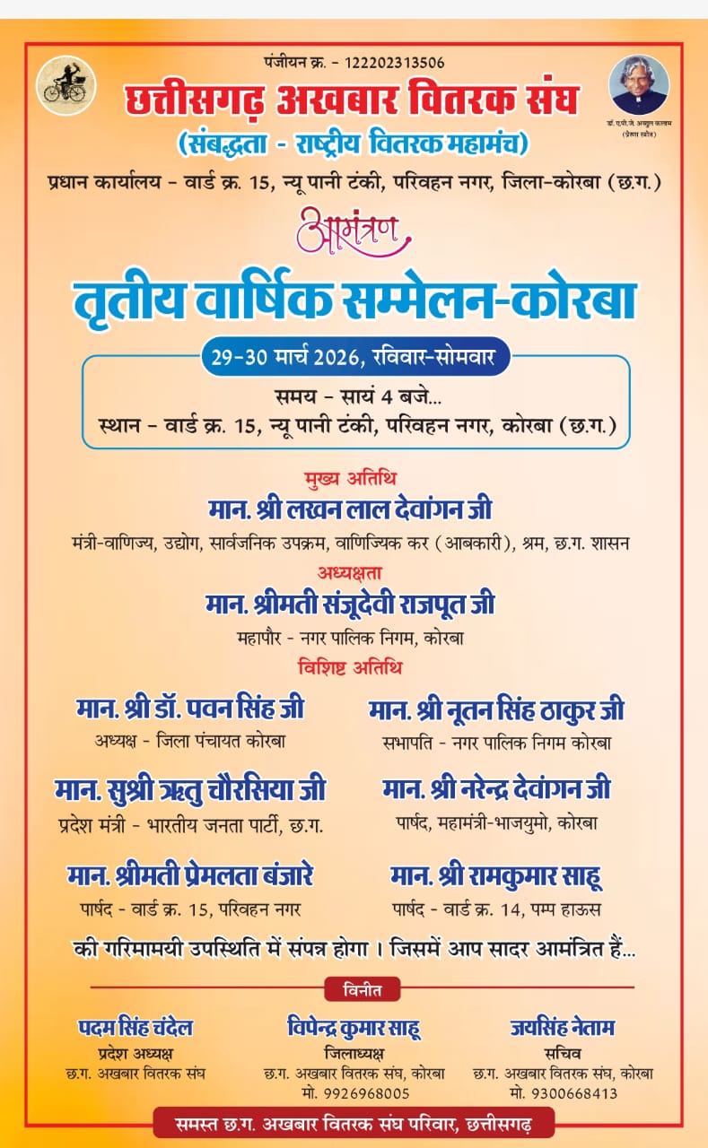 Korbavani.com। छत्तीसगढ़ अखबार वितरक संघ द्वारा कोरबा में तृतीय वार्षिक सम्मेलन का आयोजन 29 एवं 30 मार्च 2026 को किया जाएगा। यह दो दिवसीय सम्मेलन परिवहन नगर स्थित वार्ड क्रमांक 15, न्यू पानी टंकी परिसर में आयोजित होगा। कार्यक्रम का शुभारंभ प्रतिदिन सायं 4 बजे से किया जाएगा, जिसमें जिले सहित प्रदेश भर के वितरक एवं पदाधिकारी शामिल होंगे। कार्यक्रम में मुख्य अतिथि के रूप में वाणिज्य, उद्योग, सार्वजनिक उपक्रम, वाणिज्यिक कर (आबकारी) एवं श्रम विभाग के मंत्री लखन लाल देवांगन उपस्थित रहेंगे। कार्यक्रम की अध्यक्षता नगर पालिक निगम कोरबा की महापौर संजुदेवी राजपूत करेंगी। वहीं विशिष्ट अतिथि के रूप में जिला पंचायत अध्यक्ष डॉ. पवन सिंह, नगर निगम के सभापति नूतन सिंह ठाकुर, प्रदेश मंत्री (भाजपा) ऋतु चौरसिया, भाजपा के जिला महामंत्री नरेंद्र देवांगन, पार्षद प्रेमलता बंजारे एवं पार्षद रामकुमार साहू सहित अन्य जनप्रतिनिधियों की उपस्थिति रहेगी। आयोजन को सफल बनाने के लिए संघ के पदाधिकारी एवं सदस्य तैयारियों में जुटे हुए हैं। सम्मेलन में अखबार वितरण से जुड़े विभिन्न मुद्दों, समस्याओं एवं उनके समाधान पर चर्चा की जाएगी। साथ ही संगठन को मजबूत करने एवं वितरकों के हितों को लेकर महत्वपूर्ण निर्णय भी लिए जाने की संभावना है।संघ के प्रदेश अध्यक्ष पद्म सिंह चंदेल, जिलाध्यक्ष विपेंद्र कुमार साहू एवं सचिव जयसिंह नेताम ने सभी संबंधितों से कार्यक्रम में शामिल होने की अपील की है।
