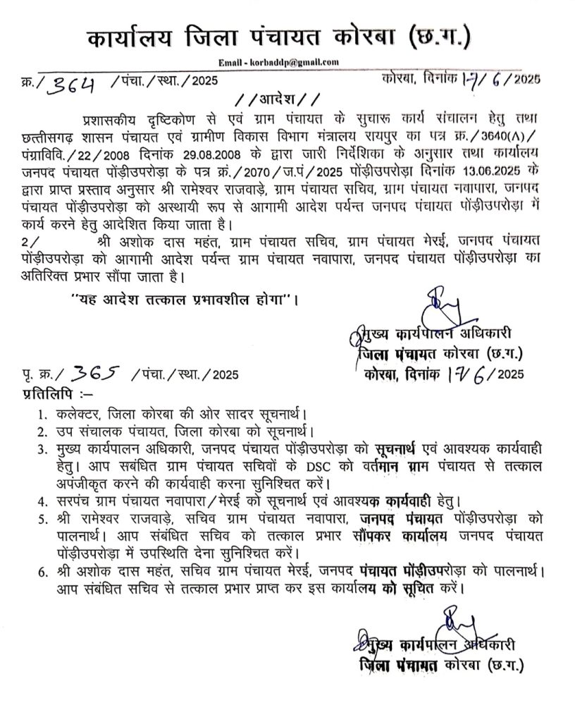 नवीन आदेश: सचिव हटे– नया प्रभार सौंपा गया– सचिव रामेश्वर राजवाड़े को तत्काल प्रभाव से जनपद कार्यालय में अस्थायी रूप से संलग्न कर दिया गया है। उनके स्थान पर ग्राम पंचायत मेरई के सचिव अशोक दास महंत को नवापारा पंचायत का अतिरिक्त प्रभार सौंपा गया है, जो आगामी आदेश तक यह जिम्मेदारी संभालेंगे।