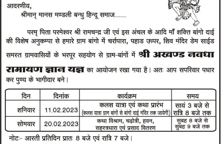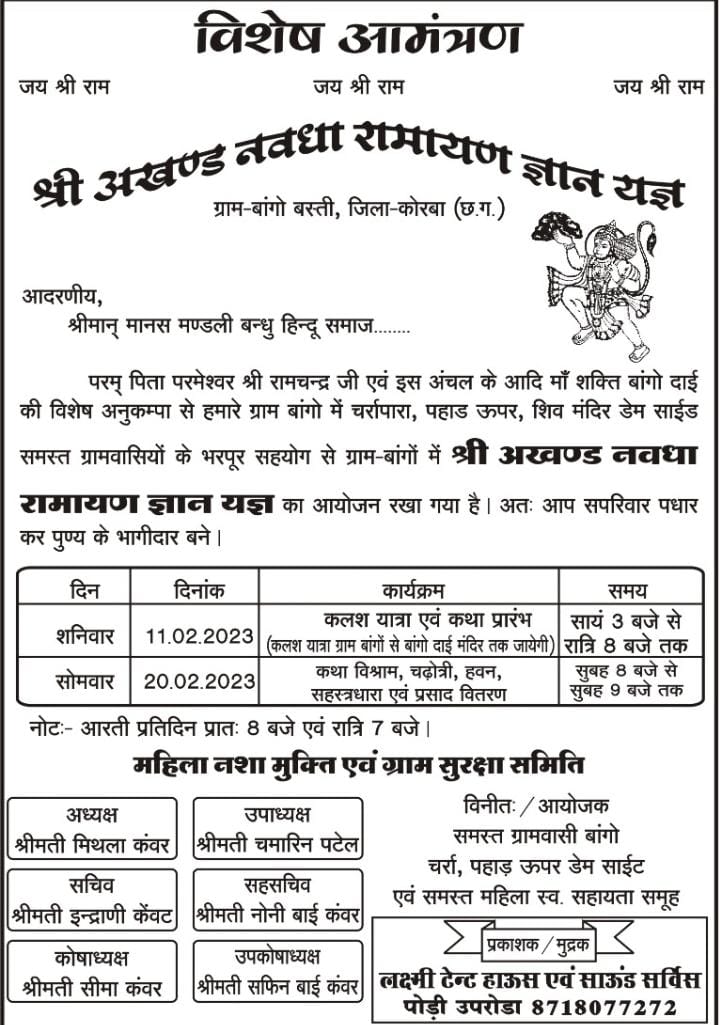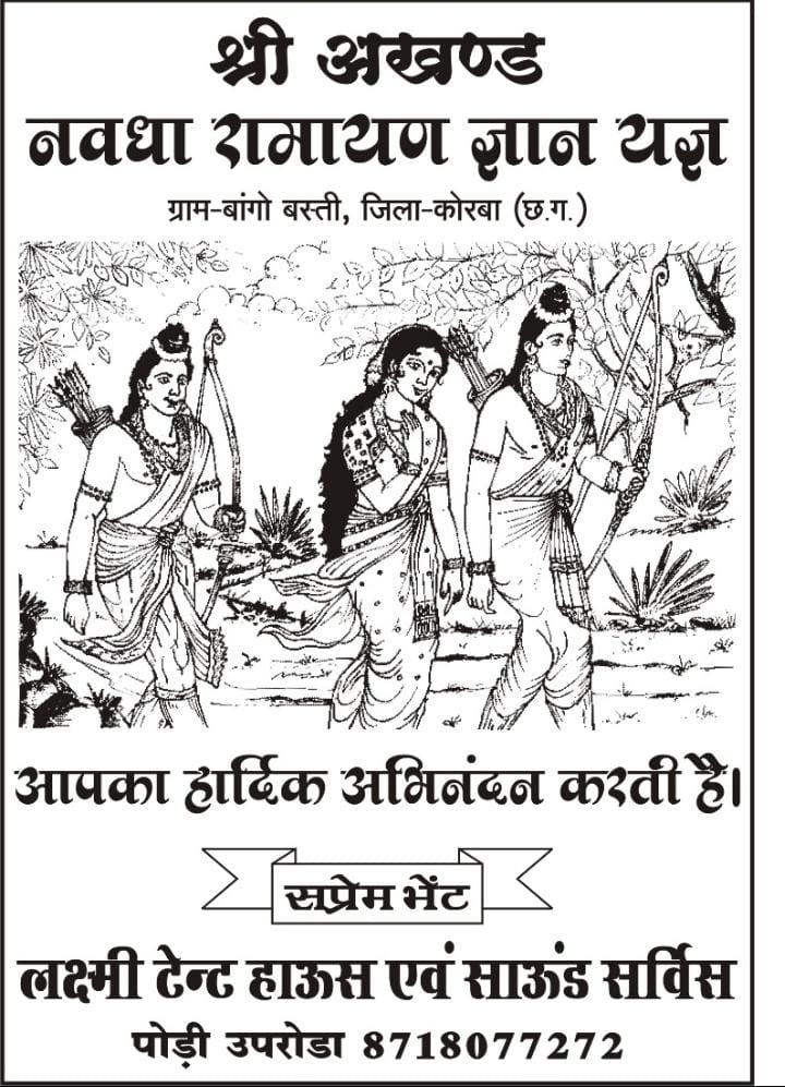 कोरबा 5फरवरी कोरबा जिले के विकासखंड पोंडी उपरोड़ा अंतर्गत ग्राम पंचायत बांगो बस्ती में सार्वजनिक श्री अखंड नवधा रामायण एवं मानस ज्ञान यज्ञ का आयोजन किया जा रहा है, कार्यक्रम के आचार्य पूज्य श्री नीरज दुबे जी पोड़ी उपरोड़ा वाले होंगे, मुख्य यजमान श्री गौकरण प्रताप सिंह सहपत्नी होंगे, मुख्य प्रवचन वक्ता श्री मधुसूदन दास जी होंगे। जहां 11 जनवरी को कलश यात्रा डीजे की भक्ति मय धुन के साथ ग्राम नगर भ्रमण करते हुए निकाला जाएगा जो बांगो दाई मंदिर से जल लेकर के पुनः कथा पंडाल कलश यात्रा की रैली पहुंचेगी जहां 9 दिन तक पूरा ग्राम नगर भक्तिमय वातावरण में रहेगा इसके लिए ग्रामवासियों द्वारा आवश्यक तैयारियां पूरी कर ली गई है, पूरे नव दिन तक अलग अलग मुहल्ले द्वारा भोजन भंडारे का व्यवस्था लिया गया है जिसमें बाहर से आए हुए सभी जन मानस भोजन प्रसाद प्राप्त कर सकेंगे। ग्रामवासियों द्वारा कार्यक्रम के सफल आयोजन के लिए महिला नशा मुक्ति एवं ग्राम सुरक्षा समिति, बजरंग दल, युवा समिति गठित किया गया है, जो अलग अलग क्षेत्र में अपनी भूमिका निभाएंगे, सर्व सम्मति से भूतपूर्व सरपंच श्री समार साय कंवर को अध्यक्ष बनाया गया है, नवयुवक मंडल एवं बजरंग दल से रविशंकर सिंह कंवर गोलू को अध्यक्ष बनाया गया है, एवं महिला नशा मुक्ति, ग्राम सुरक्षा समिति में श्रीमती मिथला कंवर को अध्यक्ष बनाया गया है। श्री विनय प्रताप सिंह तंवर विशेष सहयोगी सदस्य हैं। यह कार्यक्रम प्रति वर्ष पूरे ग्रामवासीयों कि सहायता से आयोजित किया जाता है विगत दो वर्षों तक वैश्विक महामारी करोना के कारण किसी भी प्रकार का सार्वजनिक आयोजन नहीं किया गया था उपरोक्त जानकारी लक्ष्मी टेंट हाउस एवं साउंड सर्विस पोड़ी उपरोड़ा के संचालक द्वारा दिया गया, 20 फरवरी को हवन पूजन, शहस्त्र धारा, चढ़ोत्तरी, पूर्णाहुति, प्रसाद वितरण एवं कार्यकर्ताओं का सम्मान, आभार के साथ कार्यक्रम का समापन किया जाएगा। आयोजन समिति द्वारा आसपास क्षेत्र के मानस मंडली भजन कीर्तन मंडली वक्ता एवं श्रोता समाज को अधिक से अधिक संख्या में पधारकर कार्यक्रम का आनंद लेने का आग्रह किया गया है।