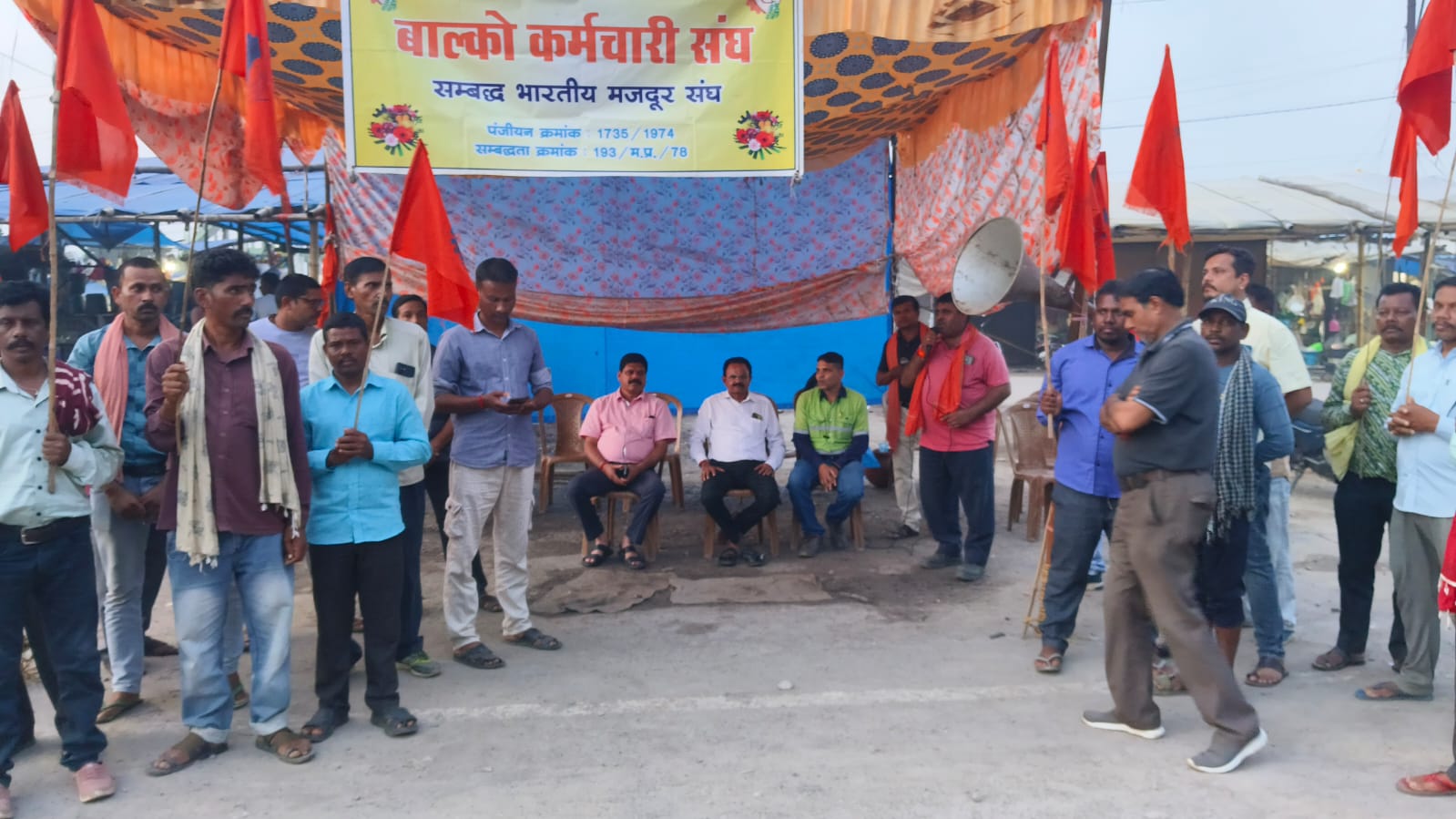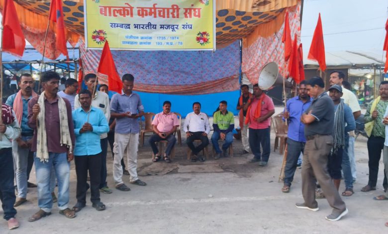 Korbavani.com- जिले के भारतीय मजदूर संघ एवं बालको कर्मचारी संघ द्वारा परसाभाटा चौक में काम बंद आंदोलन पांचवा दिन भी जारी रहा, देश के प्रथम स्थान संगठन भारतीय मजदूर संघ से संबद्ध बालको कर्मचारी संघ द्वारा क्रमबद्ध आंदोलन का पांचवा दिन था। जिसमे आज अखिल भारतीय मंत्री राधेश्याम जायसवाल, जिला भारतीय मजदूर संघ से जिलामंत्री नवरतन बरेठ ,बिजली कर्मचारी संघ प्रदेश के पूर्व अध्य्क्ष सी एस दुबे। जिसमे श्री जायसवाल जी ने साफ शब्दों में प्रबंधन को चेतावनी दी है कि जल्द ही बालको कर्मचारी संघ के लंबित निम्न मांगो का निराकरण करे दे अन्यथा समस्त भारतीय मजदूर संघ द्वारा कठोर आंदोलन किया जाएगा।