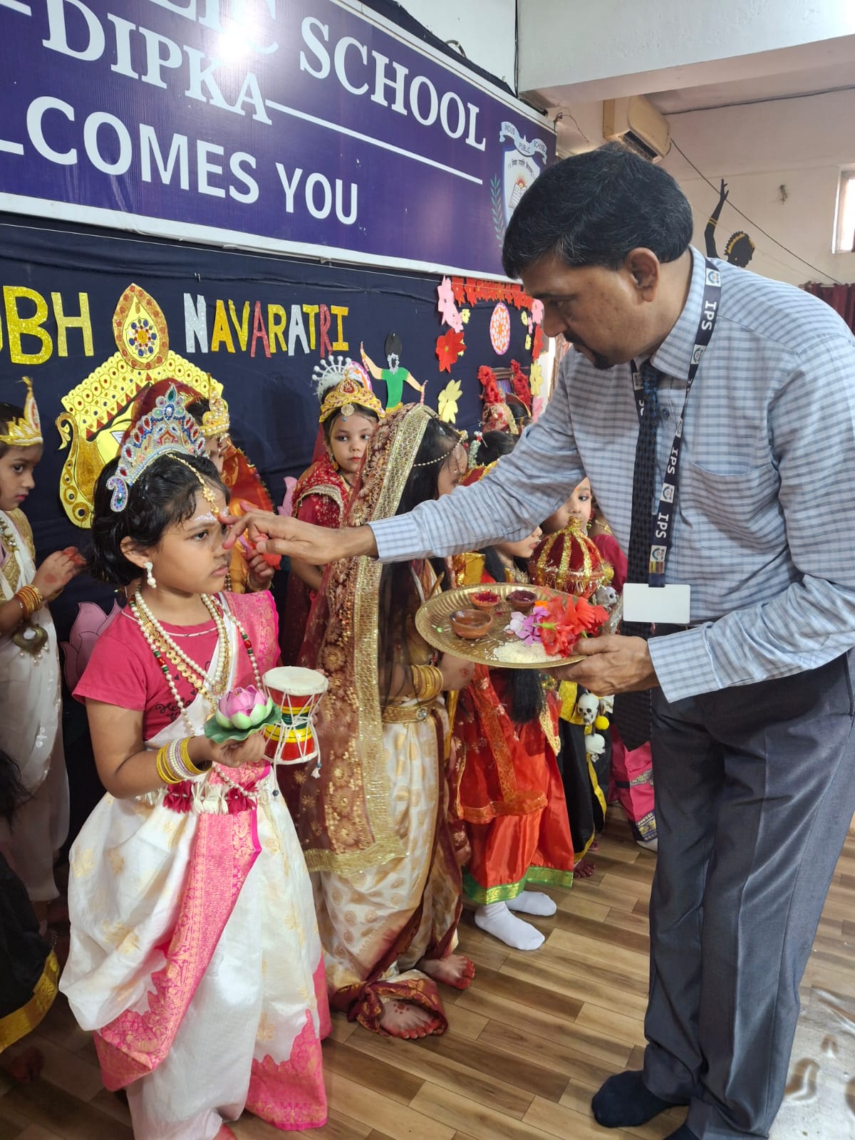 इस अवसर पर विद्यालय में माँ दुर्गा के नौ रूपों में बच्चों ने परिधान धारण किए । देखकर ऐसा लग रहा था मनो साक्षात् देवी के नौ रूप विद्यालय में अपने आशीष की वर्षा करने पधारी हैं । विद्यालय प्राचार्य डॉ. संजय गुप्ता ने सभी देवियों को तिलक लगाया, पूजा की आरती किया । समस्त शिक्षक-शिक्षिकाओं ने देवियों की पूजा अर्चना व आरती में भाग लिया ।तत्पश्चात बच्चों ने रास गरबा में भाग लिया । इस अवसर पर पर प्राचार्य डॉ. संजय गुप्ता ने सभी बच्चों एवं नगर वासियों को नवरात्री उपासना पर्व पर असत्य एवं सत्य की जीत का प्रतीक विजय दशमी की हार्दिश शुभकामनाएँ दी और कहा विजय दशमी के दिन रावण के पुतले दहन के साथ हमारे मन की बुराई रूपी रावण को भी मार कर इस त्योहार को उद्देश्यपूर्ण बनाएँ ।नवरात्रि हमें शक्ति और उत्साह देने वाले अत्यंत महत्वपूर्ण त्योहारों में से एक है। यह त्योहार हमें मां दुर्गा की शक्ति और सामर्थ्य का आदान-प्रदान करता है।मां दुर्गा की पूजा से जीवन में भय, विघ्न और शत्रुओं का विनाश होता है।इस त्यौहार को भारत के लोग सदियों से माँ दुर्गा के प्रति अपनी भक्ति को दर्शाते हुए उनके नौ रूपों की आराधना करने के लिए मनाते हैं। जिसमे नवरात्री में नौ दिनों तक पूजा-अर्चना कर व्रत रखे जाते हैं। साथ ही धूम-धाम से नाच-गाने के साथ बुराई पर अच्छाई की जीत के दिन के रूप में याद रखकर लोग इसे एक त्यौहार के रूप में मनाते हैं।