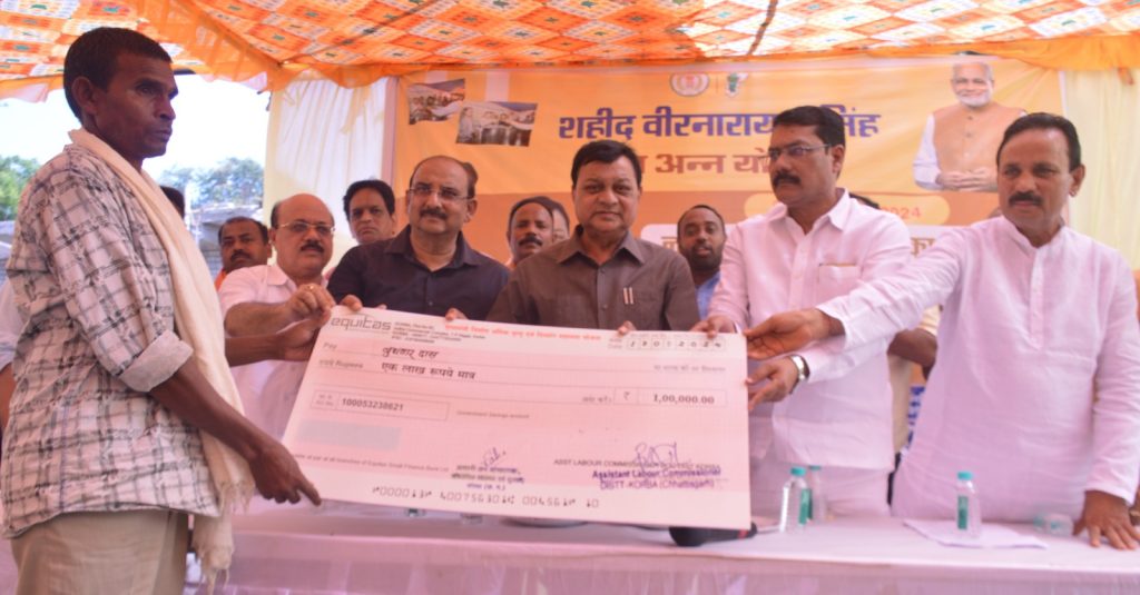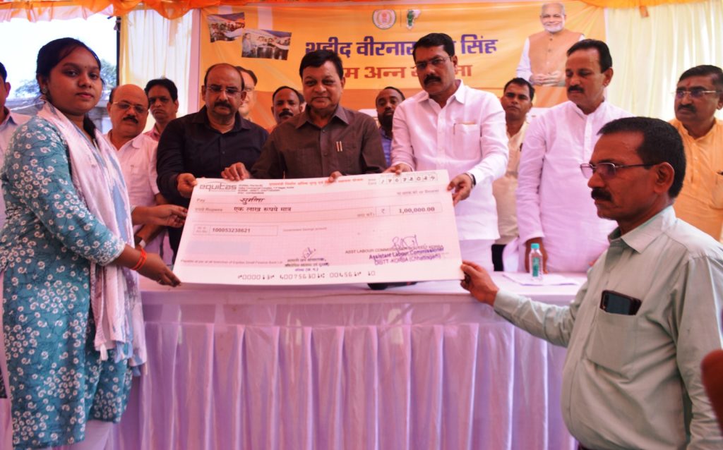 श्रम मंत्री ने हितग्राहियों को सहायता राशि का चेक प्रदान किया- कार्यक्रम में मंत्री श्री देवांगन द्वारा श्रम विभाग की विभिन्न योजनाओं के तहत अनेक हितग्राहियों को सहायता राशि का चेक प्रदान किया। जिसके अंतर्गत छत्तीसगढ़ असंगठित कर्मकार मृत्यु व दिव्यांग सहायता योजना के तहत कमला बाई दास एवं मनीराम यादव को 1-1 लाख का चेक प्रदान किया गया। इसी प्रकार मुख्यमंत्री निर्माण श्रमिक मृत्यु एवं दिव्यांग सहायता योजना के तहत सुनीता व बुधवार दास को 1-1 लाख का सहायता राशि का चेक प्रदान किया गया। असंगठित कर्मकार महतारी जतन योजना के तहत विनिता केंवट व शिव कुमार आरमो को 20-20 हजार, मिनीमाता महतारी जतन योजना के तहत राखी कंवर, पार्वती चौहान को 20-20 हजार, मुख्यमंत्री नोनी सशक्तिकरण सहायता योजना के तहत कुमारी मनीषा व भगवती को 20-20 हजार का सहायता राशि का चेक प्रदान किया गया।