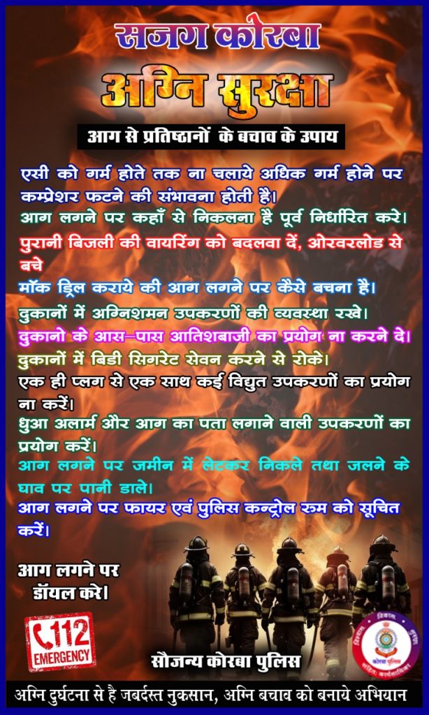 गर्मी में अग्नि सुरक्षा के संबंध में जारी किया गया पैम्फ़लेट.. Korbavani.com- पुलिस अधीक्षक कोरबा सिद्धार्थ तिवारी के द्वारा आग लगने की बढ़ रही घटनाओं को देखते हुए उनके निर्देश पर विशेष अग्नि सुरक्षा अभियान चलाया जा रहा है। इसी कड़ी में थाना/चौकी के द्वारा दुकानदारों एवं व्यापारियों के मीटिंग लेने का निर्देश दिया गया जिस पर अतिरिक्त पुलिस अधीक्षक यूबीएस चौहान एवं नेहा वर्मा के पर्यवक्षण में जिले के सभी राजपत्रित अधिकारी थाना/चौकी के द्वारा क्षेत्र के सभी व्यापारियों एवं दुकानदारों का अग्नि सुरक्षा के संबंध में मीटिंग आयोजित करवाया जा रहा है। कोरबा पुलिस के द्वारा सभी थाना क्षेत्र अंतर्गत दुकान संचालकों का अग्नि सुरक्षा के संबंध में मीटिंग आयोजित किया गया। जिसमें दुकान संचालकों को अपनी दुकान में अग्नि सुरक्षा उपकरण लगवाने एवं अन्य जानकारी दिया जा रहा है। कोरबा पुलिस के द्वारा पैम्फ़लेट जारी कर दुकानदारों को अग्नि सुरक्षा के बारे में जागरूक किया जा रहा है आग लगने पर कहाँ से निकलना है पूर्व निर्धारित करे, पुरानी बिजली की कटी वायरिंग को बदलवा दें, दुकानों में अग्निशमन उपकरणों की व्यवस्था रखे, एक ही प्लग से एक साथ कई विद्युत उपकरणों का प्रयोग ना करें, ओरवरलोड से बचे।