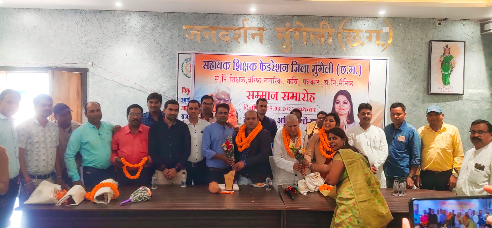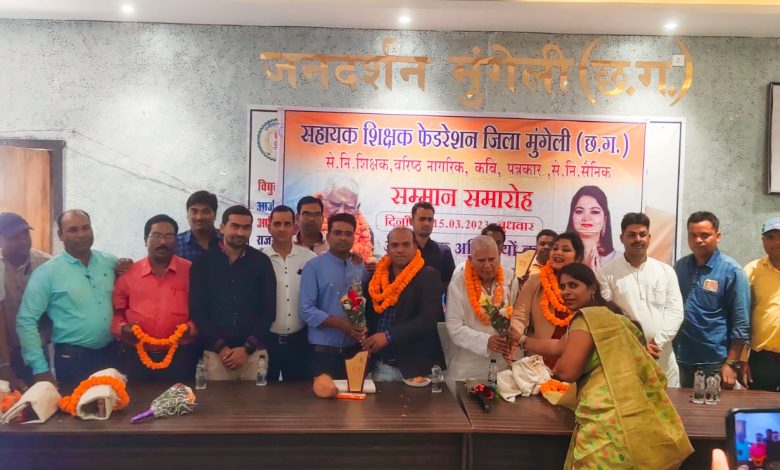 मुंगेली 15मार्च,छत्तीसगढ़ सहायक शिक्षक समग्र शिक्षक फेडरेशन मुंगेली जिले के तत्वाधान में आज कलेक्ट्रेट परिसर में सेवानिवृत्त शिक्षक सम्मान, वरिष्ठ नागरिक, कवि, पत्रकार एवं सेवानिवृत्त सैनिकों का सम्मान समारोह का आयोजन किया गया। इस आयोजन में पहली बार ऐतिहासिक कार्यक्रम शिक्षक संगठन द्वारा आयोजित किया गया। खचाखच भरे भीड़ में सम्मान समारोह का आयोजन हुआ।