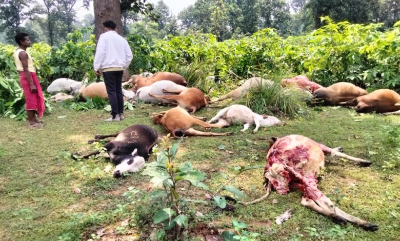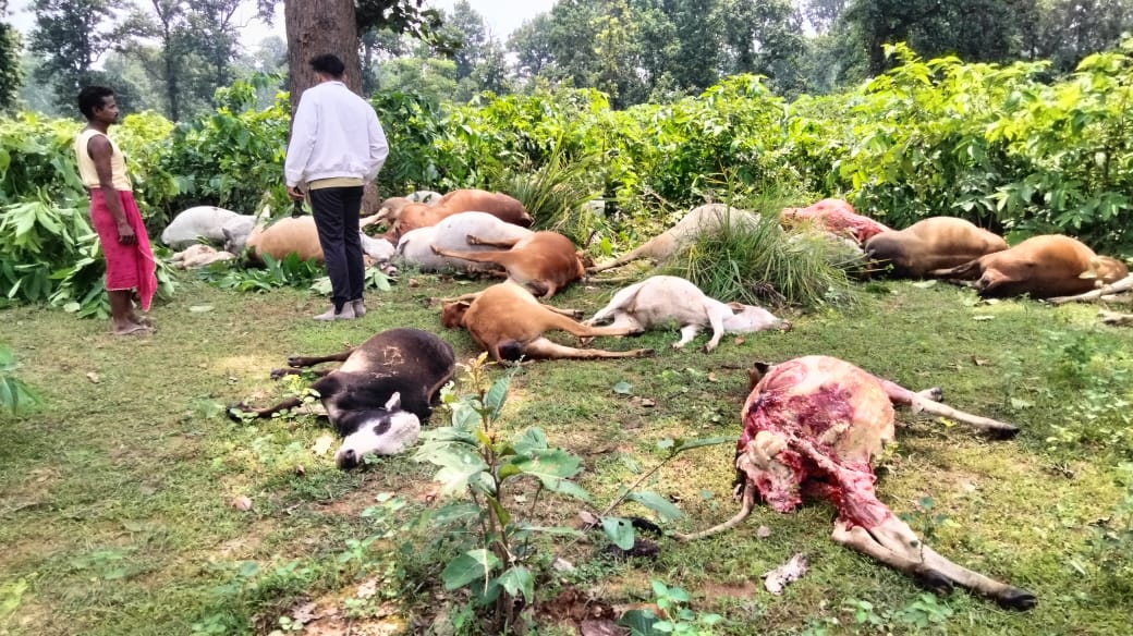 Korbavani.com- कोरबा जिलान्तर्गत ग्राम केराकछार में उस समय सनसनी फैल गई, जब आकाशीय बिजली की चपेट में आने से दो दर्जन मवेशियों की मृत्यु हो गई। घटनास्थल से थोड़ी दूर होने के कारण चरवाहे बच गए। बताया जा रहा हैं की उक्त घटना में करीब एक दर्जन किसानों को भारी नुकसान हुआ है। सूचना पर पहुंची पुलिस ने मौके का निरीक्षण किया। तत्पश्चात पोस्टमार्टम के लिए पशु चिकित्सा विभाग को पत्राचार किया है। जानकारी के अनुसार कोरबा विकासखंड से करीब 20 किलोमीटर दूर ग्राम पंचायत केराकछार स्थित है, जहां रहने वाले अधिकांश ग्रामीण खेती किसानी का काम करते हैं। ग्रामीणों ने घरों में गाय और बैल भी पाला हुआ है। बताया जा रहा है कि मवेशियों को खुले में में छोड़ देने से खेत में लगी फसल को नुकसान होने की आशंका बनी रहती है। मवेशी खेत में घुसकर लहलहाती फसल को अपना निवाला बना लेते हैं। जिससे बचने ग्रामीणों ने मवेशियों को चराने दो चरवाहे की व्यवस्था की है। प्रतिदिन की तरह मंगलवार की सुबह भी चरवाहे मवेशियों को लेकर चराने जंगल गए थे। वे दोपहर करीब दो बजे ग्राम के करीब आराम कर रहे थे। थोड़ी दूर में ही मवेशी भी बैठे थे। इस बीच अचानक मौसम ने करवट ली। तेज गरज के बूंदाबांदी होने लगी। चरवाहे मवेशियों को लेकर बस्ती की ओर ले जाते, इससे पहले ही आकाशीय बिजली गिर गयी। जिसकी चपेट में आने से 9 गाय, 7 बैल व 4 बछड़े की घटना स्थल पर ही मृत्यु हो गई, जबकि कई मवेशी झुलस गए। चरवाहे थोड़ी दूर होने के कारण सुरक्षित बच निकले। उन्होंने गांव पहुंचकर घटना की जानकारी दी। ग्रामीणों ने मौके पर पहुंचकर देखा तो मवेशी मृत पड़े थे। जिसकी सूचना पुलिस को दी गई। रजगामार पुलिस चौकी प्रभारी मानसिंह ध्रुव अपनी टीम के साथ घटनास्थल पहुंचे। उन्होंने मौके का मुआयना करते हुए पोस्टमार्टम के लिए पशु चिकित्सा विभाग को पत्र लिखा है। बुधवार को पुलिस और राजस्व विभाग की मौजूदगी में वैधानिक कार्यवाही उपरांत मृत मवेशियों के पोस्टमार्टम की प्रक्रिया पूरी की जाएगी।