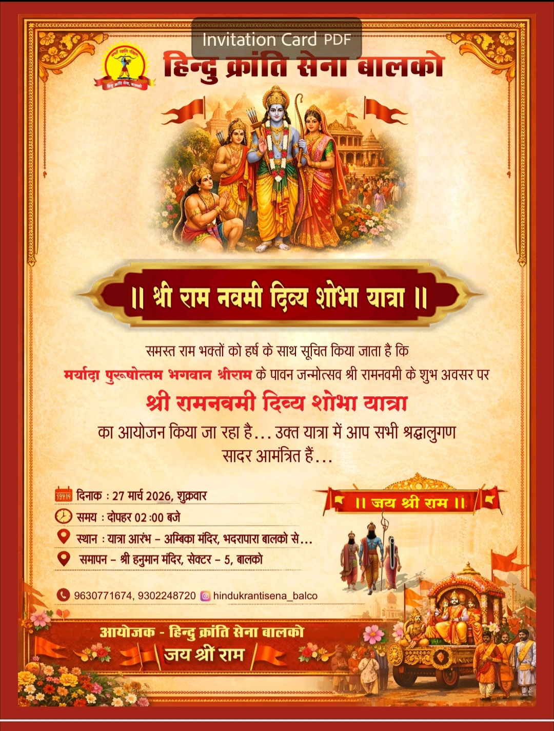 Korbavani.com- कोरबा जिले के बालको क्षेत्र में श्री रामनवमी के पावन अवसर पर भव्य दिव्य शोभा यात्रा का आयोजन किया जा रहा है। इस आयोजन को लेकर पूरे क्षेत्र में उत्साह और श्रद्धा का माहौल बना हुआ है। आयोजक संस्था हिन्दू क्रांति सेना बालको के अनुसार, 27 मार्च 2026, शुक्रवार को दोपहर 2 बजे यात्रा की शुरुआत की जाएगी। शोभा यात्रा अम्बिका मंदिर, भदरापारा बालको से प्रारंभ होकर विभिन्न मार्गों से गुजरते हुए श्री हनुमान मंदिर, सेक्टर-5 बालको में समाप्त होगी। इस दौरान हजारों श्रद्धालुओं के शामिल होने की संभावना है, जिससे पूरा क्षेत्र भक्ति में सराबोर नजर आएगा। कार्यक्रम में विभिन्न आकर्षक झांकियां और सांस्कृतिक प्रस्तुतियां विशेष आकर्षण का केंद्र रहेंगी। करमा नृत्य, राउत नाचा, शिव-पार्वती झांकी, अयोध्या झांकी, मां काली झांकी और राधा-कृष्ण झांकी सहित कई राज्यों की झलकियां इस शोभा यात्रा को और भी भव्य बनाएंगी। साथ ही लाइटिंग, डीजे साउंड, आतिशबाजी और फूल वर्षा जैसी विशेष व्यवस्थाएं भी की गई हैं। आयोजकों ने सभी श्रद्धालुओं से अधिक से अधिक संख्या में शामिल होकर आयोजन को सफल बनाने की अपील की है। प्रशासन भी सुरक्षा व्यवस्था को लेकर पूरी तरह सतर्क है। यह आयोजन धार्मिक आस्था के साथ-साथ सामाजिक और सांस्कृतिक एकता का संदेश देने वाला होगा।
