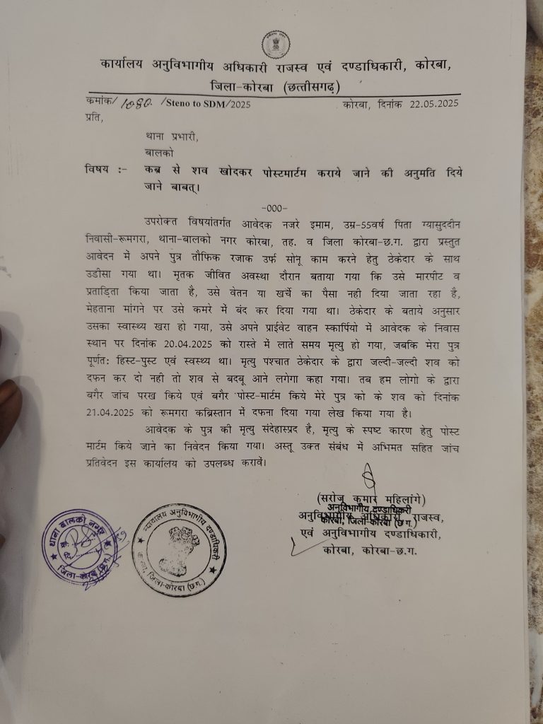 प्रशासन की पहल– एसडीएम कार्यालय में शिकायत के बाद अधिकारी सरोज कुमार महिलांगे ने मामले की गंभीरता को देखते हुए शव का उत्खनन और मेडिकल जांच के निर्देश दिए हैं। साथ ही, समूचे प्रकरण की जांच रिपोर्ट प्रस्तुत करने के निर्देश भी जारी किए गए हैं। पीड़ित परिवार ने जल्द न्याय की मांग की है अब सभी की निगाहें कोरबा पुलिस पर टिकी हैं कि वह कब तक आपराधिक प्रकरण दर्ज कर ठेकेदारों के विरुद्ध कार्रवाई करती है।–